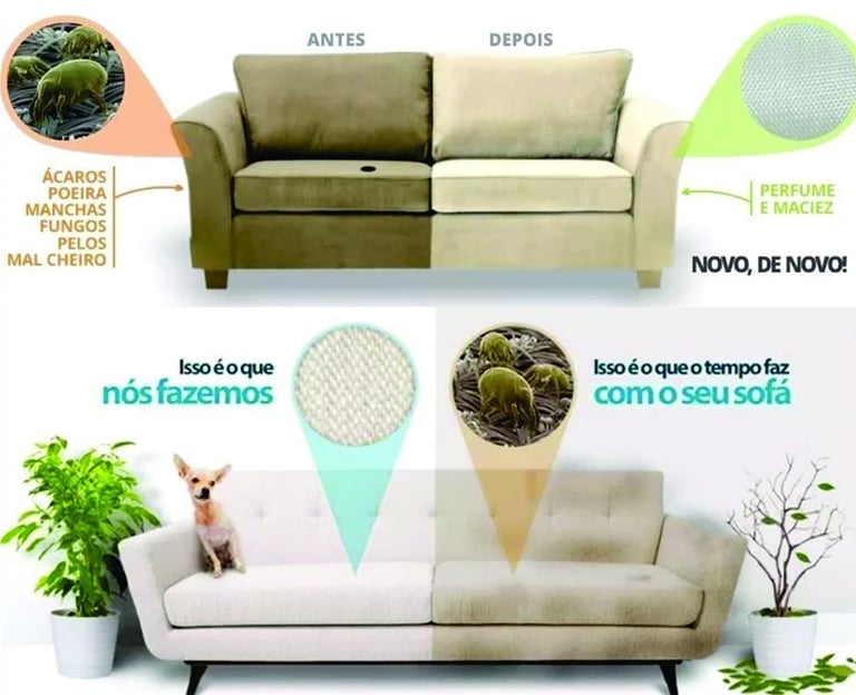 A limpeza remove sujeiras superficiais. Já a higienização é mais profunda, eliminando ácaros, bactérias, fungos, odores e manchas leves, promovendo mais saúde e conforto para o ambiente.